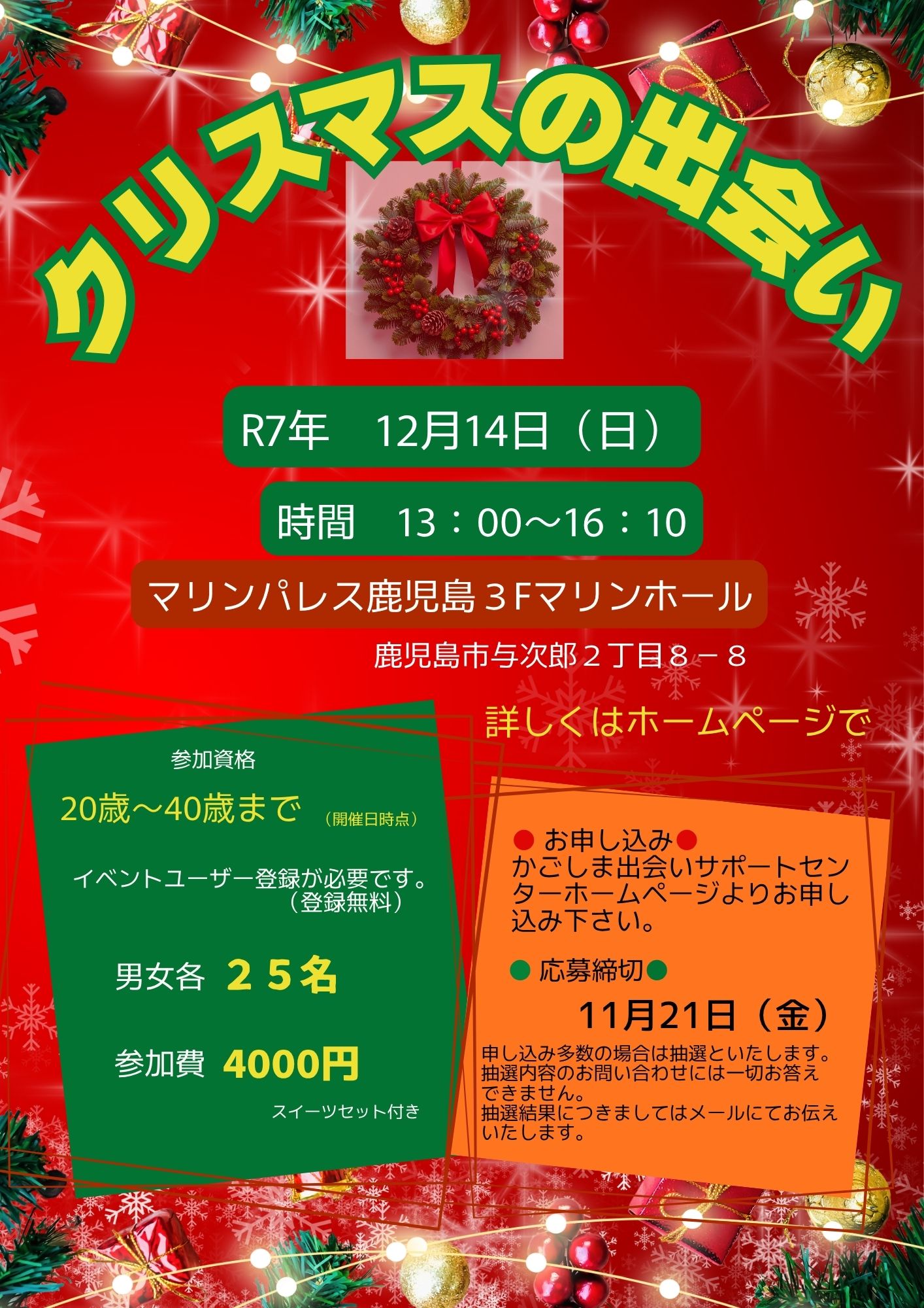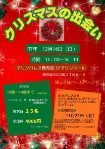 12月14日(日)イベント 『クリスマスの出会い♪』 2025.11.12 かごしま出会いサポートセンターは、「結婚したいけれど出会いの機会がない」「素敵な出会いがあれば結婚したい」という人に出会いの場を提供するため、婚活イベント「かごしまキューピッド」を開催しております。 ~クリスマス直前!海辺のホテルで婚活イベント~ 新しい出会いを探しませんか~ チラシR7.12月14日 イベント詳細はこちら イベントご応募につきましては、事前にイベントユーザー登録(無料)が必要です。 ホームページの「イベントユーザー登録」コーナーからご登録後、ご応募ください。 ラブキャン 2025~自然と素敵な出会いを~ » 一覧に戻る