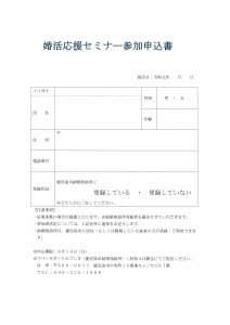 「婚活応援セミナー参加申込書」をマリーサポートかごしま(鹿児島市結婚相談所)に持参又は郵送にて、令和元年8月18日(日)までに提出してください。