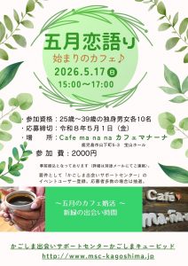 5月17日(日)イベント 『五月恋語り♪』 2026.04.21 かごしま出会いサポートセンターは、「結婚したいけれど出会いの機会がない」「素敵な出会いがあれば結婚したい」という人に出会いの場を提供するため、婚活イベント「かごしまキューピッド」を開催しております。 新緑の出会い、始まりのカフェ イベントチラシ R8.5.17 イベント詳細はこちら イベントご応募につきましては、事前にイベントユーザー登録(無料)が必要です。 ホームページの「イベントユーザー登録」コーナーからご登録後、ご応募ください。 STEP UP!婚活相談会のお知らせ » 一覧に戻る