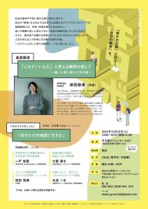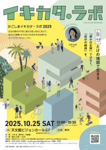 かごしま「イキカタ・ラボ」2025 2025.10.15 イキカタ・ラボ ~ かごしまイキカタ・ラボ 2025 ~ 社会の期待や不安に揺れる若い世代に向けて、 自分の「納得」を大切にする生き方を応援する ライフプランセミナーです。 SPECIAL GUEST 作家:岸田 奈美 「イキカタ・ラボ」チラシデータ 日 時:2025年10月25日(土) 13:00~15:30 (開場 12:30 ※オンラインも可) 会 場:天文館ビジョンホール 6F 定 員:100名 (要予約・先着順) 参加費:無 料 対 象:概ね18歳~30代 申込はこちらから↓↓↓↓ ☆かごしまイキカタ・ラボ2025 参加申込フォーム ☆鹿児島県HP « 【12月】出張登録閲覧窓口 秋恋~OUTDOOR Meeting 2025 Autumn~ » 一覧に戻る
